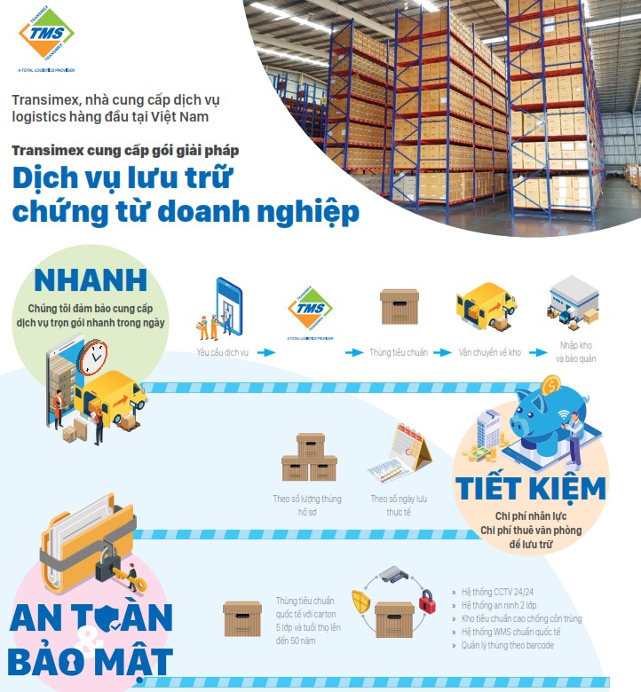 Transimex rất hân hạnh giới thiệu một dịch vụ hoàn toàn mới của công ty nhằm đáp ứng các yêu cầu này – kho lưu trữ chứng từ với tiêu chí “Tiết kiệm- Bảo mật”.