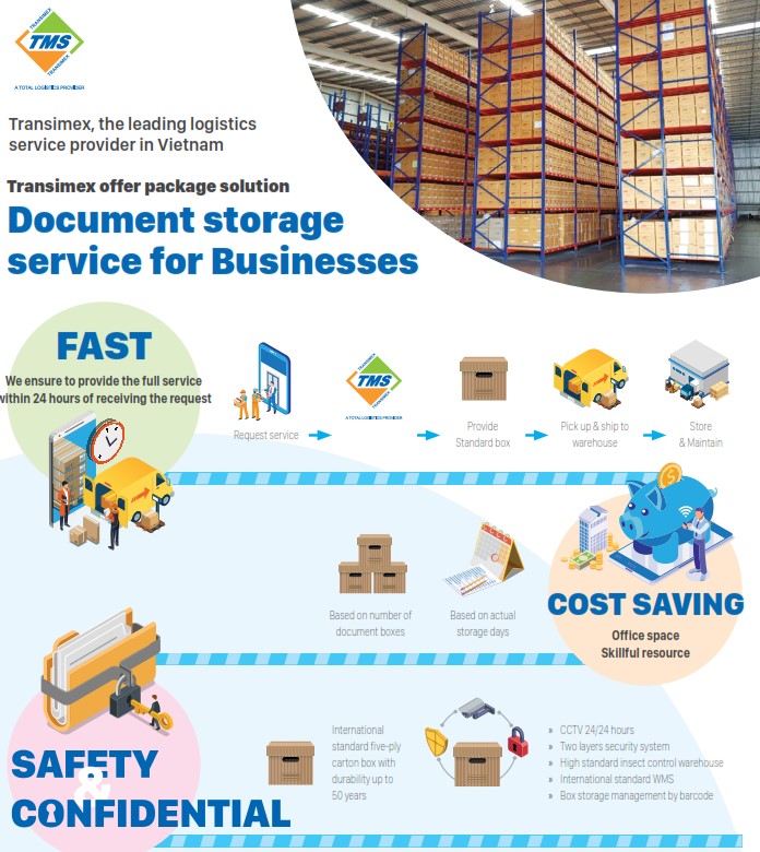 Transimex (TMS) one of biggest logistics service provider in Vietnam - just launched a new logistics service product – Enterprise Document Storage specializes in document management & archiving solutions for our customers on & off-site managing their long-term archiving and document management needs. Our products and services are aimed at, NMCs, SME’s, banks, hospitals, telecommunication companies, insurance companies with philosophy “Saving and Securing”.