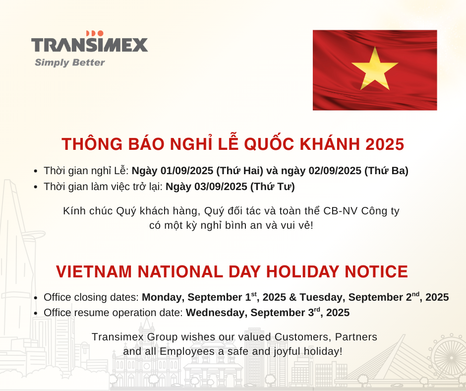 Nhân dịp kỷ niệm 80 năm Quốc khánh nước Cộng hòa Xã hội Chủ nghĩa Việt Nam, Transimex Group trân trọng thông báo lịch nghỉ lễ như sau: